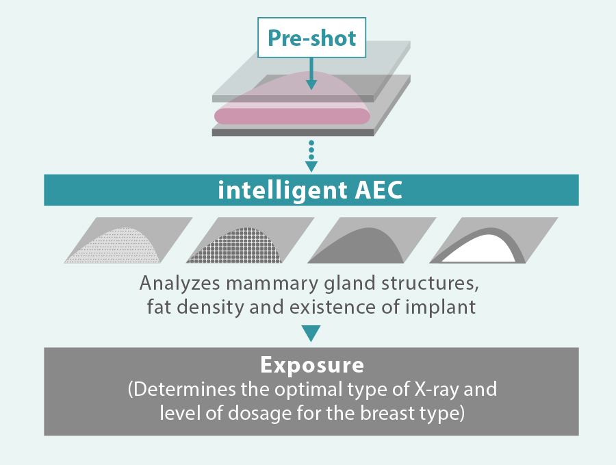 O Intelligent AEC tem vantagens na definição da dose apropriada para um exame em comparação com sistemas AEC convencionais onde a posição do sensor é fixa. Pela análise das informações obtidas a partir de imagens de dose baixa, o Intelligent AEC permite considerar a densidade da glândula mamária (tipo de mama) ao definir a energia de raios X e o nível de dose necessário. Pode ser usado mesmo na presença de implantes; o Intelligent AEC permite um cálculo mais preciso dos parâmetros de exposição do que é possível com sistemas AEC convencionais. Ao permitir o uso de exposição automática para o implante de mama, o Intelligent AEC pode melhorar ainda mais o fluxo de trabalho do exame.