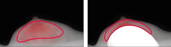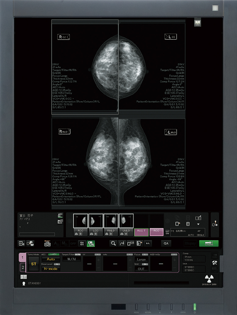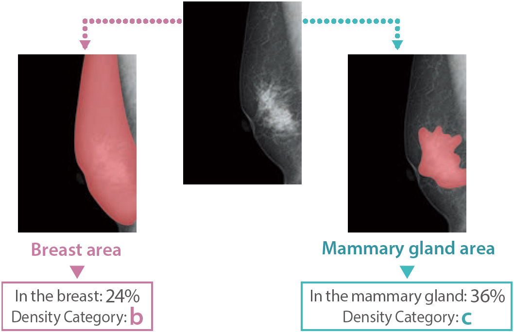 Como informação para os médicos classificarem a mama mais quantitativamente, o cálculo na área da glândula mamária foi adicionado à “função de medição do volume da glândula mamária”, que calcula automaticamente o volume da glândula mamária na área da mama a partir de uma imagem de mamografia. Essa medição do volume da glândula mamária na área da mama/região da glândula mamária também pode ser calculada com imagens de tomossíntese