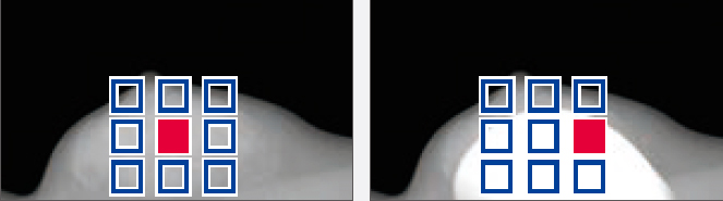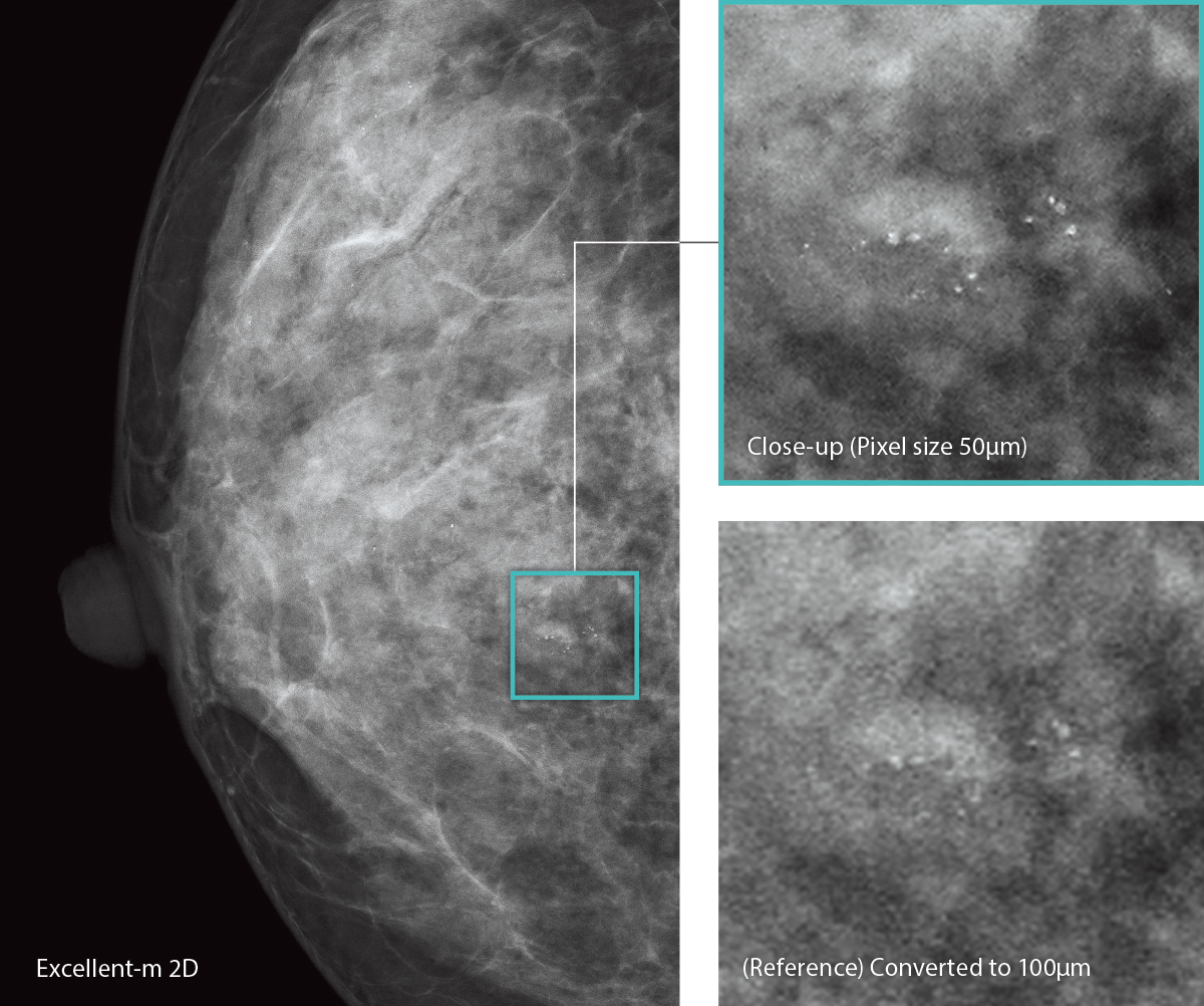 AMULET Innovality utiliza um detector de tela plana de conversão direta feito de selênio amorfo (a-Se) que exibe excelente eficiência de conversão no espectro de raios X mamográficos. O detector HCP (Padrão de fechamento hexagonal) coleta eficientemente sinais elétricos convertidos dos raios X para obter alta resolução e baixo ruído. Este design exclusivo possibilita a realização de uma DQE (Determinação do rendimento quântico) maior do que com a matriz de pixels quadrados de painéis TFT convencionais. Com as informações coletadas pelo detector HCP, a AMULET Innovality cria imagens de alta definição com um tamanho de pixel de 50 μm; o melhor disponível com um detector de conversão direta.