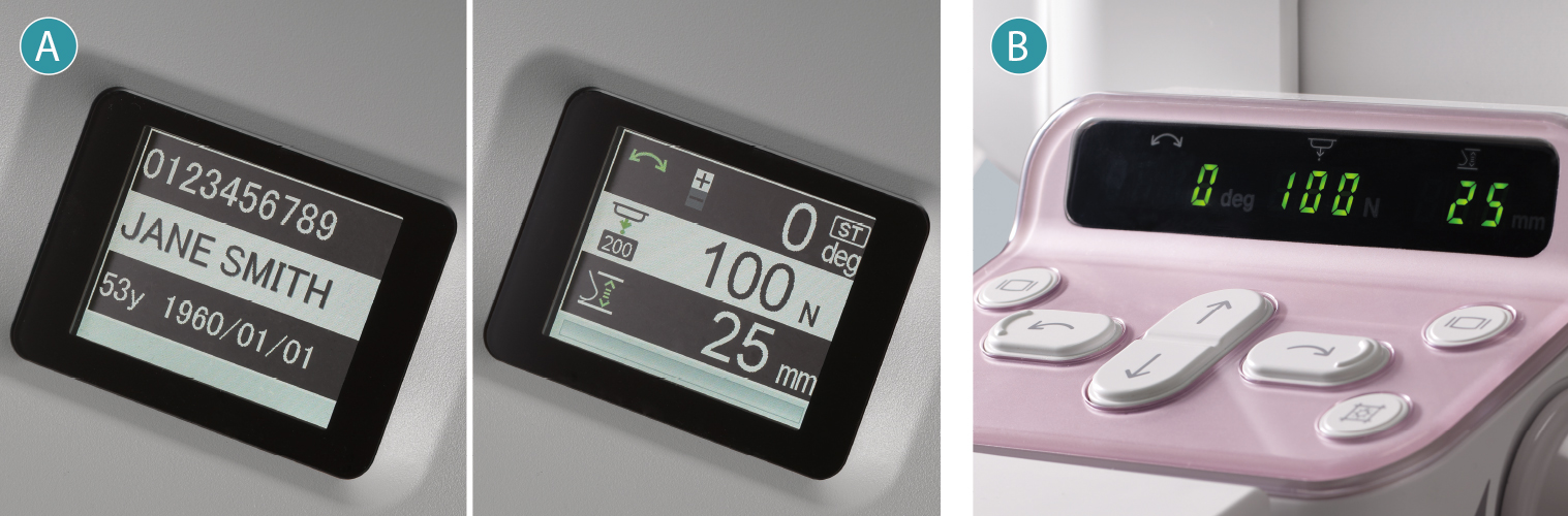 As informações mostradas no visor (A) na base de B, a unidade de exposição pode ser alternada entre informações do paciente (ID, nome, data de nascimento etc.) e informações de posicionamento (ângulo do braço giratório, força de compressão e espessura da mama). As informações de posicionamento também podem ser confirmadas no visor (B) no braço de compressão.