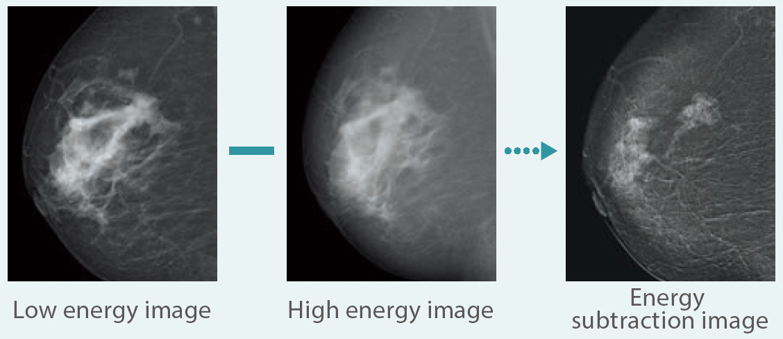 Com uma compressão, ele executa continuamente imagens de baixa tensão do tubo (baixa energia) perto da geração de imagens de mamografia comum e geração de imagens de alta tensão do tubo (alta energia) com um filtro de cobre; em seguida, gera e exibe automaticamente uma imagem de subtração das imagens obtidas. Essa imagem de subtração compõe uma imagem que enfatiza tecidos específicos.
