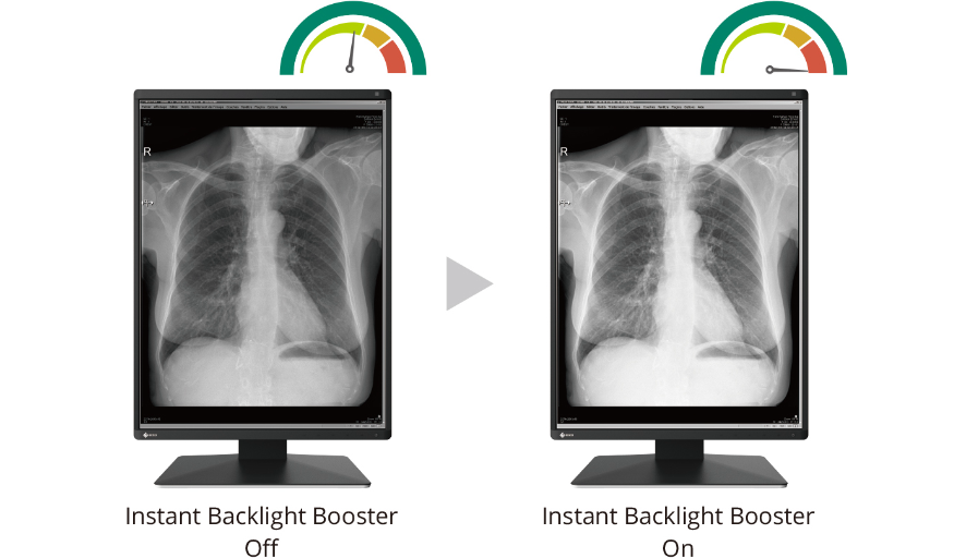 A função Instant Backlight Booster maximiza temporariamente o brilho do monitor para facilitar a visualização de imagens médicas detalhadas. Uma única tecla de atalho permite que os usuários ativem a função em vários monitores ao mesmo tempo, para que possam visualizar facilmente mais de uma tela nas mesmas condições de alto brilho.